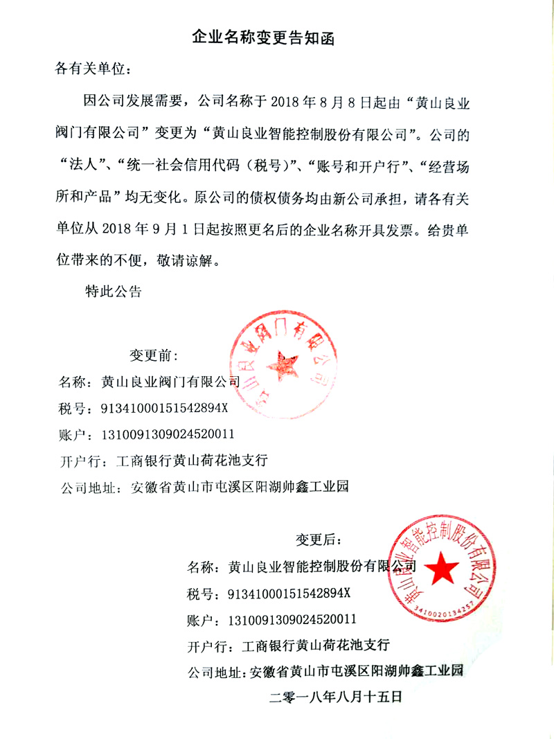 因公司發(fā)展的需要,公司名稱于2018年8月8日起由“黃山良業(yè)閥門有限公司”變更為“黃山良業(yè)智能控制股份有限公司”。公司的“法人”、“統(tǒng)一社會(huì)信用代碼(稅號(hào))”、“賬號(hào)和開戶行”、“經(jīng)營場所和產(chǎn)品”均無變化。原公司的債券債務(wù)均由新公司承擔(dān),請(qǐng)各有關(guān)單位從2018年9月1日起按照變更后的企業(yè)名稱開具發(fā)票,給貴單位帶來的不便,敬請(qǐng)諒解。