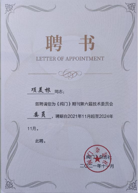 文章詳情2021年11月26日,閥門期刊第六屆技術委員會換屆會議暨第一次工作會議在上海嘉定希爾頓逸林酒店召開。項美根終身名譽董事長應邀出席,并被誠摯邀請項美根同志擔任本刊第六屆技術委員會委員。