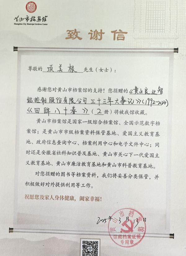 文章詳情2025年3月13日上午, 公司終身名譽董事長項美根先生以個人名義分別向黃山市檔案館和屯溪區(qū)檔案館捐贈圖書《黃山良業(yè)智能控制股份有限公司三十三年大事記》(1992-2024)和《回眸八十春》。