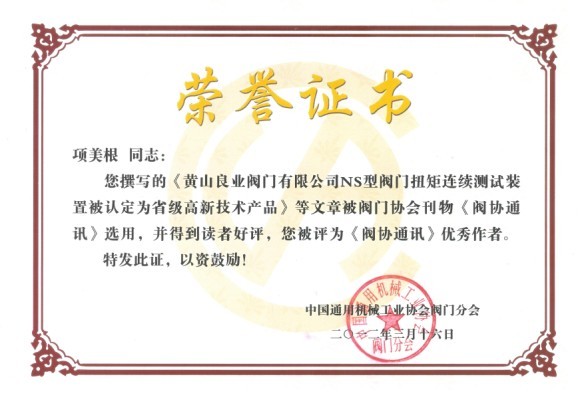 黃山良業(yè)閥門有限公司創(chuàng)辦20年來,董事長項美根同志一直十分重視企業(yè)的宣傳報導工作,并親自帶頭寫作,他寫的報導文章,很多都得到刊物的采用,并得到讀者的好評。最近,他被中國閥門協(xié)會評為《閥協(xié)通訊》優(yōu)秀作者稱號。