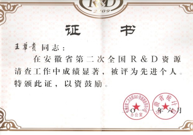 王華貴同志的扎實(shí)工作,得到了企業(yè)領(lǐng)導(dǎo)與統(tǒng)計(jì)工作主管領(lǐng)導(dǎo)部門(mén)的一致好評(píng),2007年度曾被中國(guó)通用機(jī)械工業(yè)協(xié)會(huì)閥門(mén)分會(huì)評(píng)為優(yōu)秀統(tǒng)計(jì)員,2011年在安徽省第二次全國(guó)r&d資源清查工作中由于表現(xiàn)突出,成績(jī)顯著,被該項(xiàng)清查小組和安徽省統(tǒng)計(jì)局評(píng)為“先進(jìn)個(gè)人”稱(chēng)號(hào)。