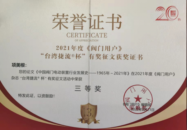繼2021年2月、4月項美根名譽(yù)董事長撰寫的論文《中國閥門電動裝置行業(yè)發(fā)展史——1965-2021》在《閥門用戶》發(fā)表后,最近又分三次分別...